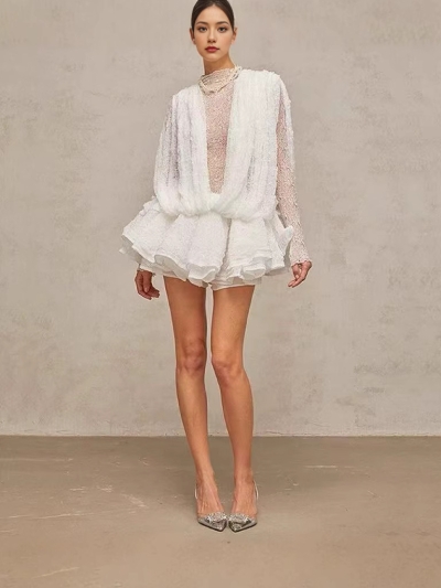 2025 French Mesh Lace Long Sleeves with Pleated Puffy Design Pure Lust Dress