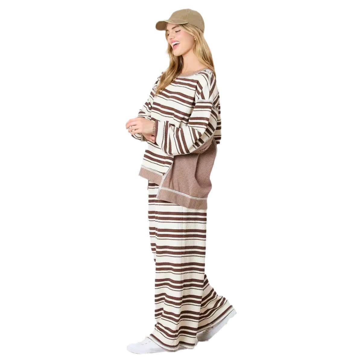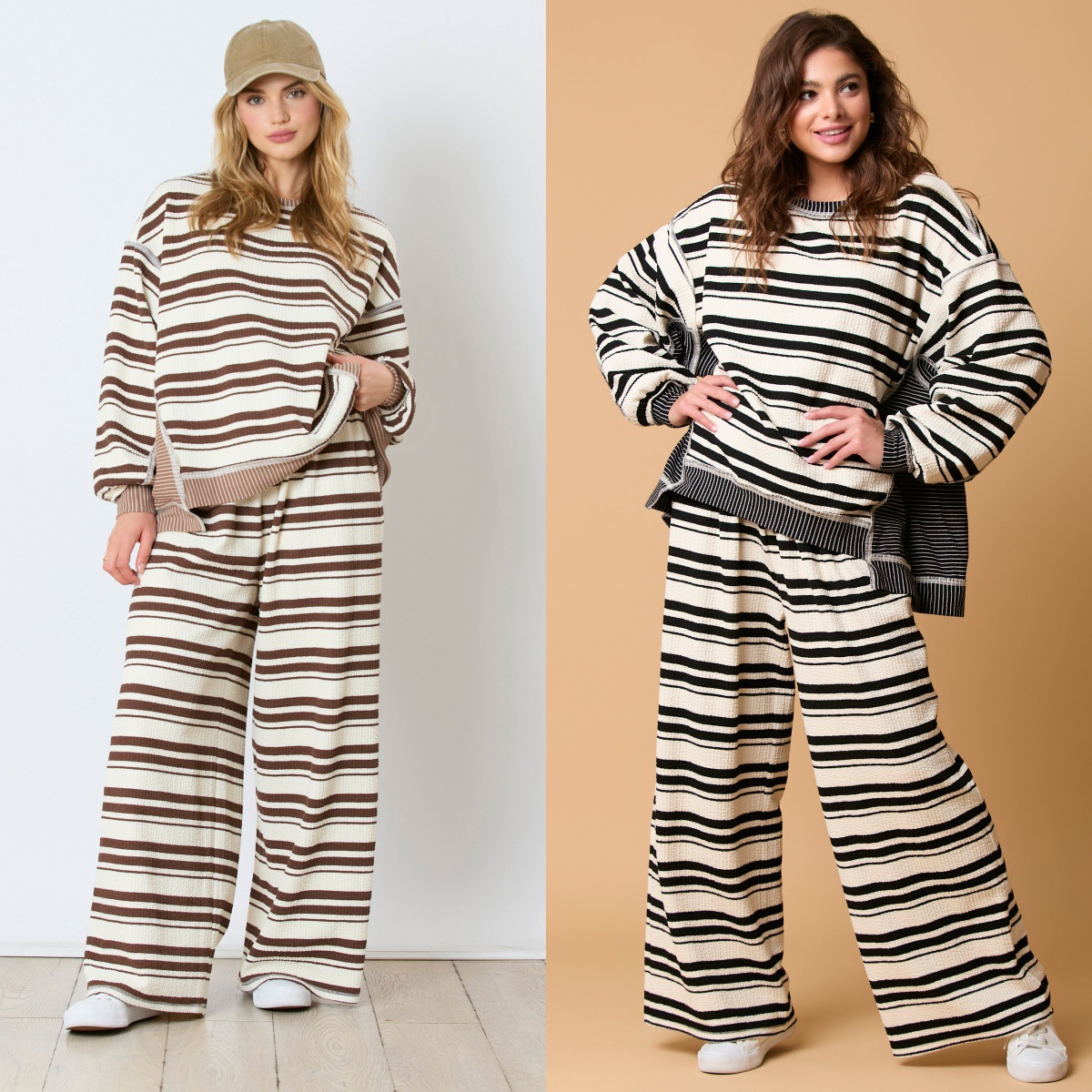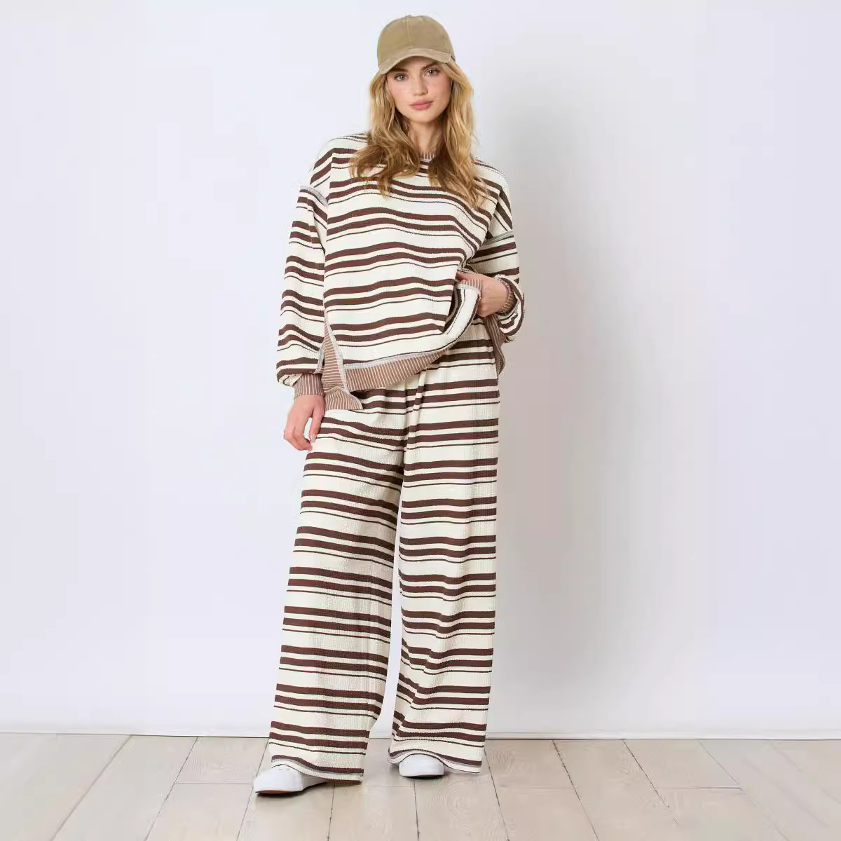 2024 Autumn and Winter New European and American Cross-border Amazon Two-color Striped Long-sleeved Pants Casual Loose Two-piece Suit for Women