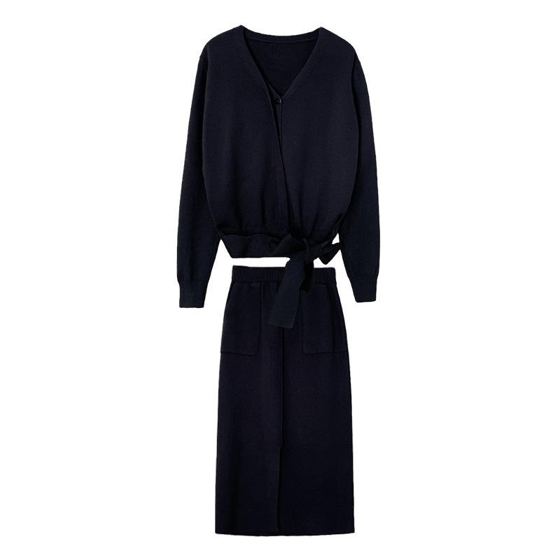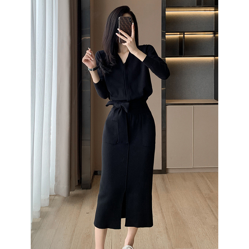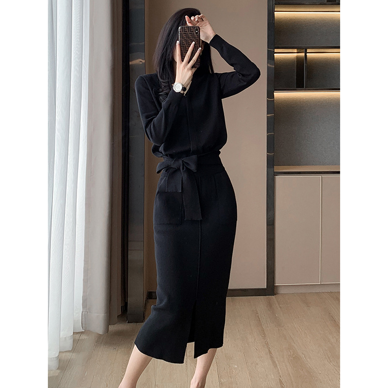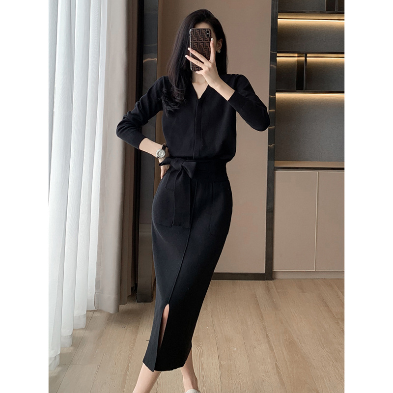 6787 French Hepburn Style Autumn New Knitted suit High-end Strap Sweater Split Skirt Two-piece Set