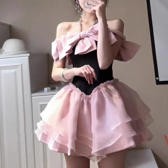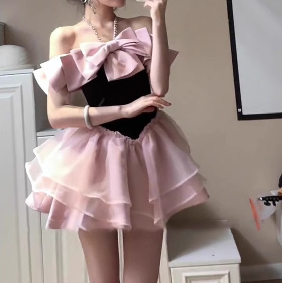 Black Powder Bow Diamond Hanging Neck Tutu Skirt Birthday Dating Fairy Skirt Dress 2024 Spring New