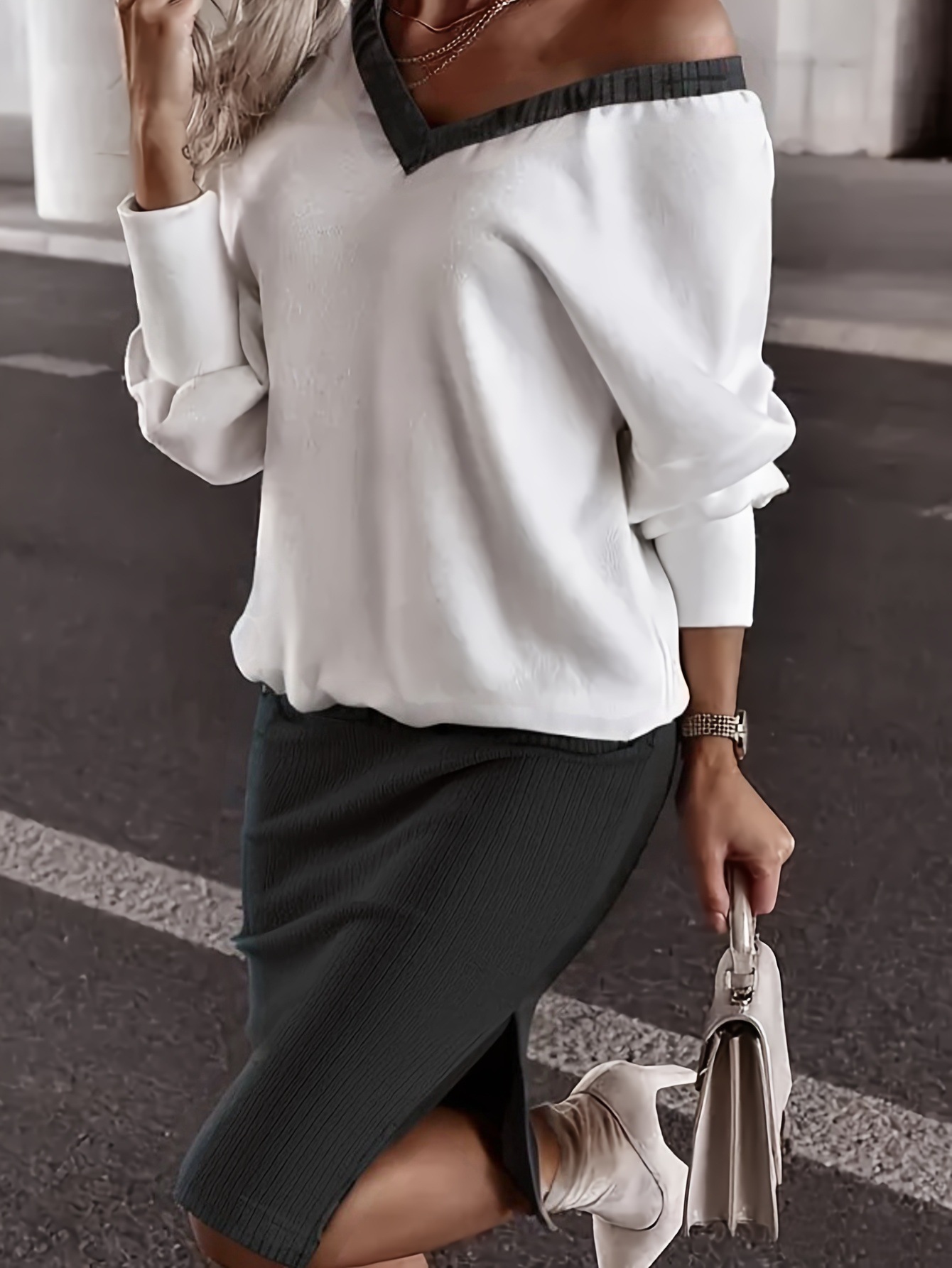 Cross-border Fashion Women's Outgoing Casual Loose V-neck Sweat suit Tight Overskirt Long Sleeve Top Two-piece Set