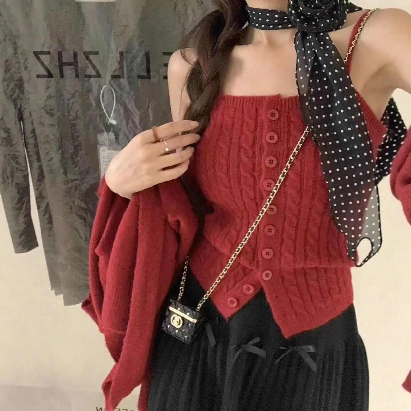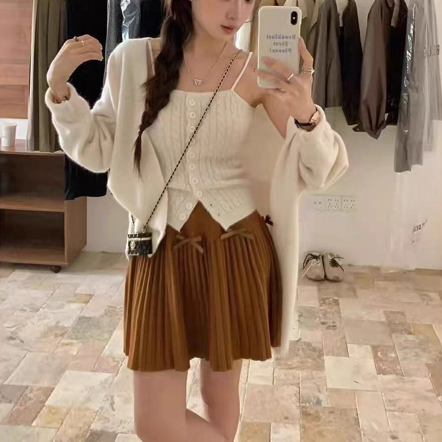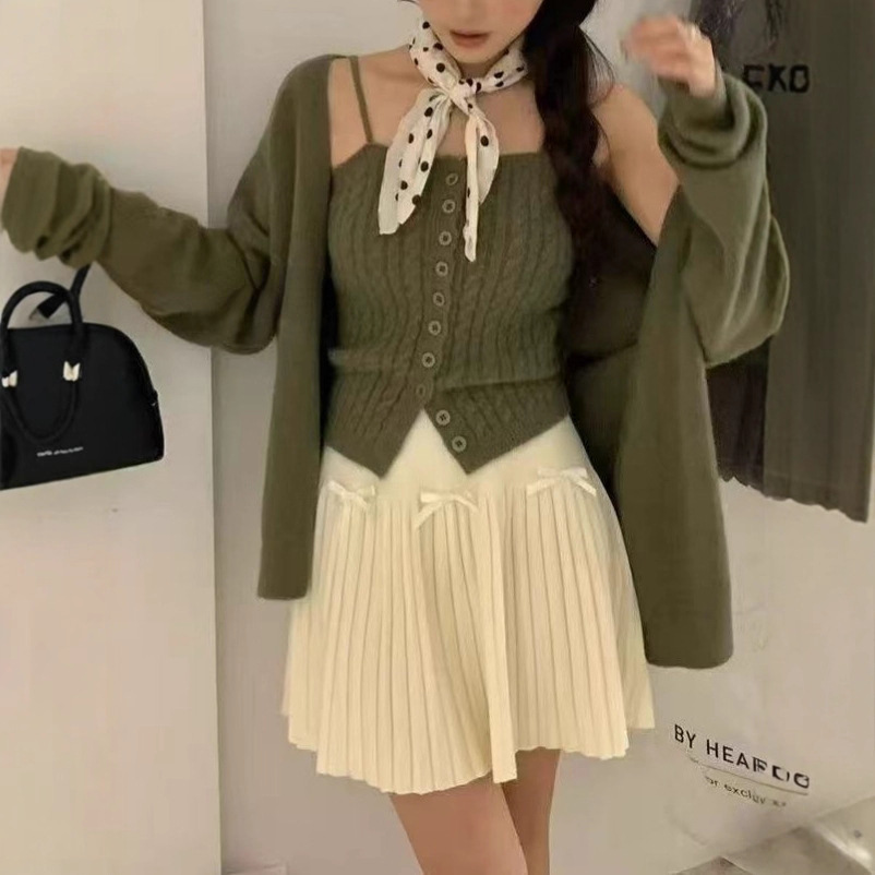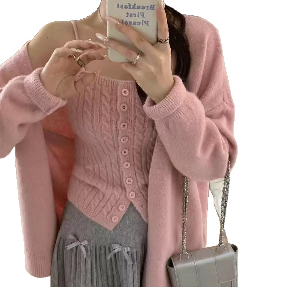 Two-Piece Hong Kong Style Retro Twist-Breasted Knitted Vest V-Neck Cardigan Suit for Women in Autumn and Winter Loose Lazy Tops
